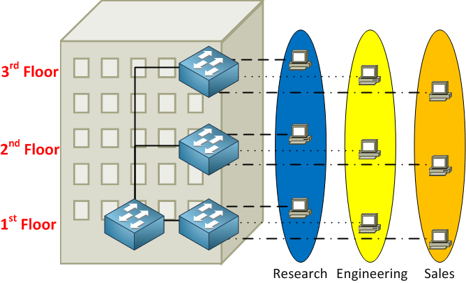 - 사용자를 물리적으로 같은 위치에 모을 필요가 없습니다. 위 그림에서 Engineering VLAN의 사용자들이 1층, 2층, 3층에 분산되어 있는 것을 볼 수 있습니다.