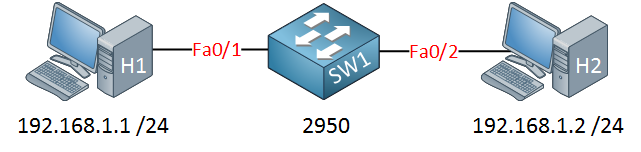 간단한 예시로 시작하겠습니다. H1과 H2가 SW1에 연결되어 있습니다.