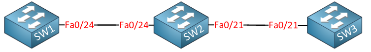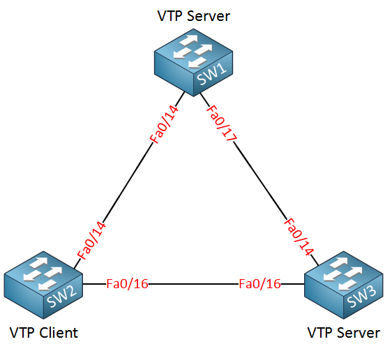 3대의 스위치(SW1: VTP Server, SW2: VTP Client, SW3: VTP Server)를 사용합니다. 모든 스위치 간에 트렁크가 설정되어 있습니다.