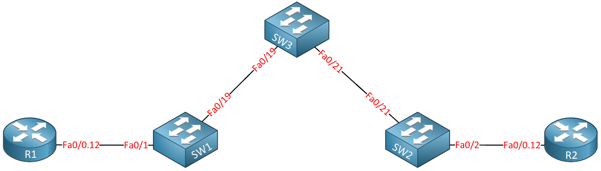 R1과 R2는 고객 사이트이며, SW1, SW2, SW3은 서비스 프로바이더 네트워크입니다. 고객은 두 사이트 간에 VLAN 12를 사용하고, 프로바이더는 VLAN 123으로 고객 트래픽을 운반합니다.