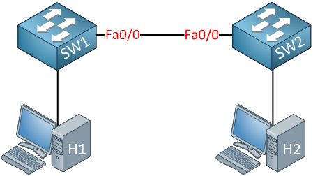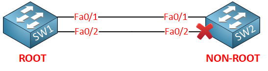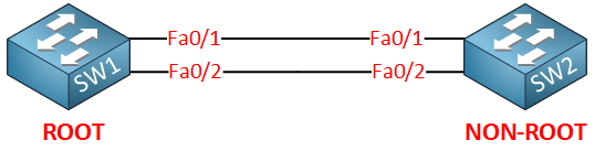 두 대의 스위치(SW1, SW2)가 이중 링크로 연결된 상황을 생각해 보겠습니다: