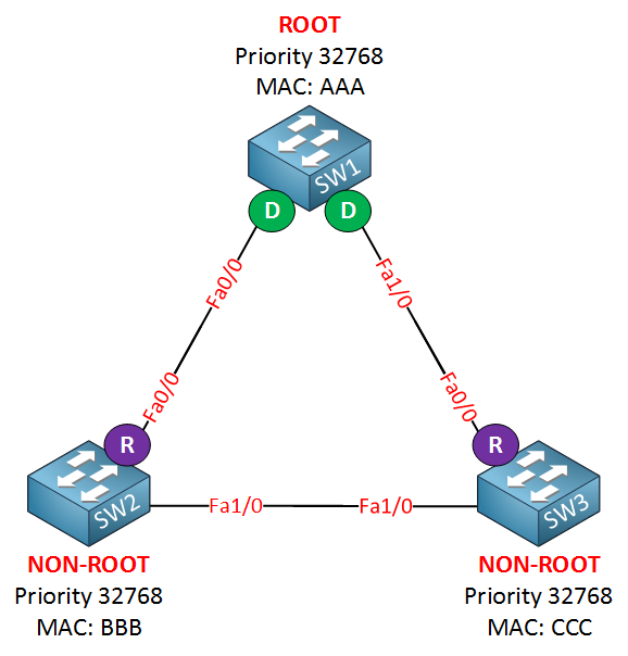 SW1#show spanning-tree VLAN0001 Spanning tree enabled protocol ieee Root ID Priority 32769 Address 0011.bb0b.3600 Cost 4 Port 1 (FastEthernet0/14) Hello Time 2 sec Max Age 20 sec Forward Delay 15 sec Bridge ID Priority 32769 (priority 32768 sys-id-ext 1) Address 0019.aa9e.b000 Hello Time 2 sec Max Age 20 sec Forward Delay 15 sec Aging Time 300 sec Interface Role Sts Cost Prio.Nbr Type ---------------- ---- --- --------- -------- ---- Fa0/14 Root FWD 4 128.1 P2p Fa0/24 Desg FWD 4 128.2 P2p