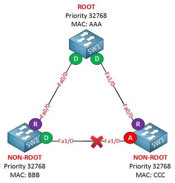 SW2#show spanning-tree VLAN0001 Spanning tree enabled protocol ieee Root ID Priority 32769 Address 0011.bb0b.3600 Cost 4 Port 1 (FastEthernet0/14) Hello Time 2 sec Max Age 20 sec Forward Delay 15 sec Bridge ID Priority 32769 (priority 32768 sys-id-ext 1) Address 001a.a1e2.4400 Hello Time 2 sec Max Age 20 sec Forward Delay 15 sec Aging Time 300 sec Interface Role Sts Cost Prio.Nbr Type ---------------- ---- --- --------- -------- ---- Fa0/14 Root FWD 4 128.1 P2p Fa0/24 Altn BLK 4 128.2 P2p