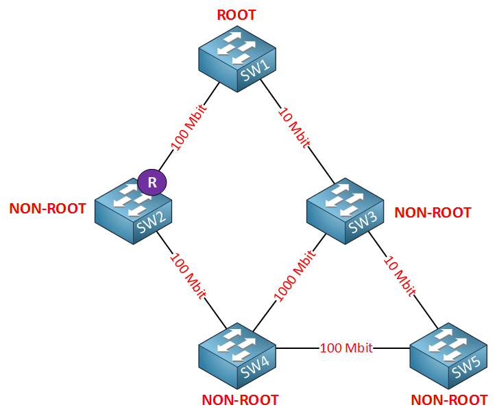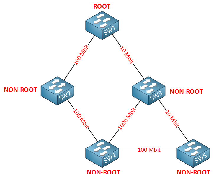 5대의 스위치가 서로 다른 속도의 링크로 연결된 토폴로지입니다.