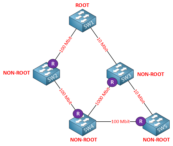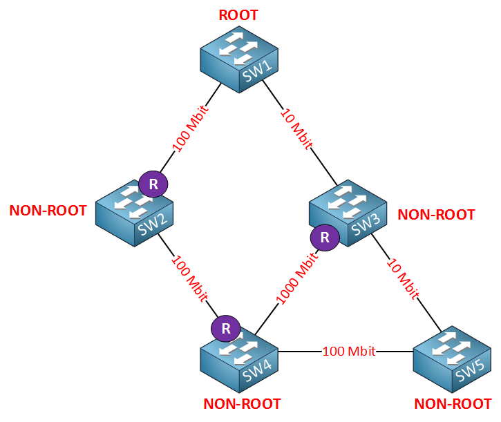 각 스위치는 가장 낮은 코스트의 경로를 선택하여 루트 포트를 결정합니다.