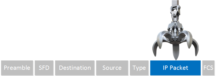 - 프레임에서 IP 패킷을 역캡슐화하고 이더넷 프레임을 폐기합니다.